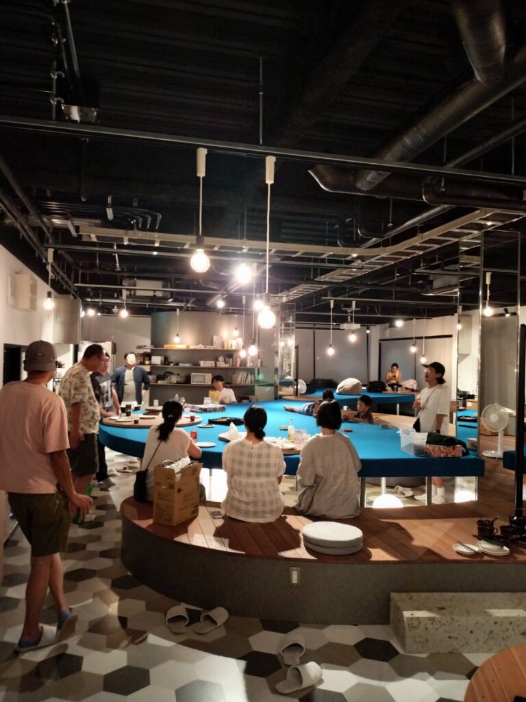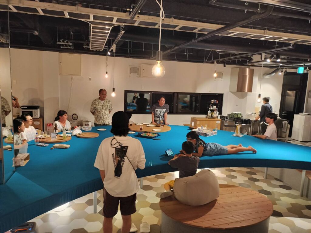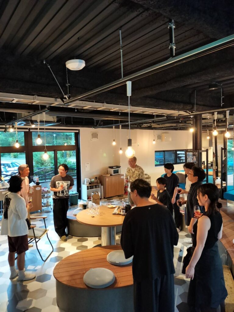 JAMフロアは普段より少し賑やか。旅の人、まちの人、常連さん、はじめましての方まで、肩書きも年齢もごちゃまぜで集まりました。BGMは夏の余韻、テーブルには軽いおつまみとドリンク。堅苦しいプログラムはなし。“乾杯して、話して、笑う”ことが中心の会でした。